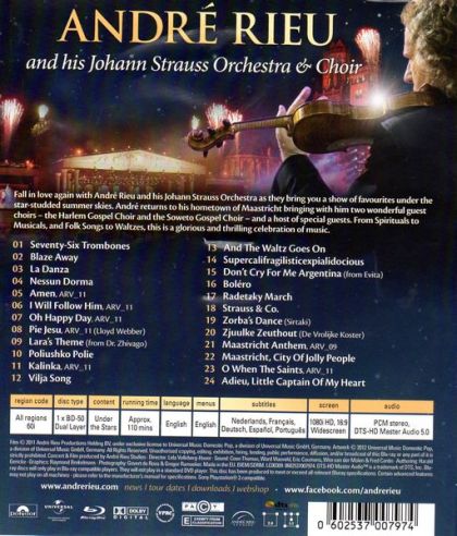 Fall in love again with André Rieu and his Johann Strauss Orchestra as they bring you a colourful concert with over two-hours of beautiful melodies under the star-studded summer skies. Once again André Rieu transformed the Vrijthof square in his hometown Maastricht into a grand, romantic open-air concert hall with room for about ten thousand people for his traditional summer evening concerts. André returns to Maastricht bringing with him two wonderful guest choirs – the Harlem Gospel Choir and the Soweto Gospel Choir – and a very special guest: Oscar-winning actor Sir Anthony Hopkins! The Hollywood-based star is a great admirer of André Rieu and wrote a piece called “And The Waltz Goes On” specially with Rieu in mind. André Rieu performed it in Maastricht for the first time for such a large crowd.
