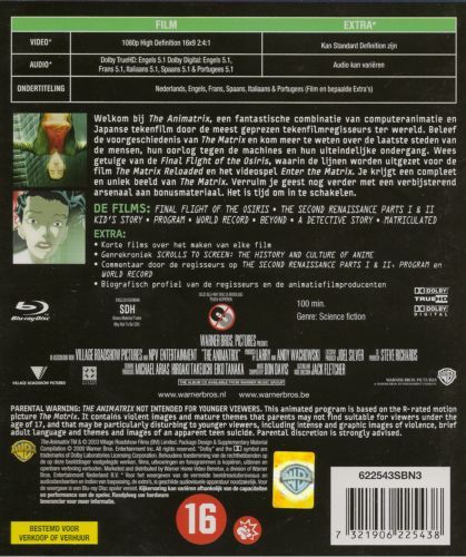 Straight from the creators of the groundbreaking Matrix trilogy, this collection of short animated films from the world's leading anime directors fuses computer graphics and Japanese anime to provide the background of the Matrix universe and the conflict between man and machines. The shorts include Final Flight of the Osiris, The Second Renaissance, Kid's Story, Program, World Record, Beyond, A Detective Story and Matriculated.