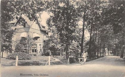 Behalve in de verzamelingen van de vele liefhebbers, bevinden zich in menige oude schoenendoos met foto’s, op zolder of ergens in een kast, ook oude ansichtkaarten. Het is altijd weer leuk om ze eens goed te bekijken. Als voorbeeld hiervan deze kaart van de hoek Kerkweg en Raadhuisstraat, omstreeks het jaar 1910 (zie afbeelding 1). Deze toont ons de villa ‘Christina’, toen bewoond door de Maarssense notaris D.H. van Nieuwenhuizen. De onbekende jongen met fiets - misschien een zoon van de notaris want een fiets was in die tijd nog een grote luxe - poseert gedwee op de volkomen lege Kerkweg voor het grote huis, dat omringd is door een schitterende tuin. Het maken van een dergelijke foto zou nu waarschijnlijk niet meer lukken omdat dit qua verkeer thans een van de drukste punten van Maarssen is. De prentbriefkaart, een uitgave van de firma F.J. Vermeulen uit Uithoorn, is oorspronkelijk een zwart-wit foto, die later werd ingekleurd omdat kleurenfotografie toen nog nauwelijks bestond.
