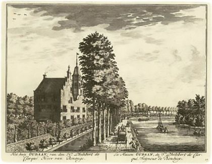 Afb. 1. De Langegracht te Maarssen in de achttiende eeuw. Tussen de huizen zijn openingen, de toegang tot de stegen, in de gevelwand zichtbaar. Originele tekening van Daniël Stoopendaal (1672-1726). Praktisch de gehele achttiende eeuw is deze afbeelding veelvuldig als gravure gebruikt voor fraaie boeken als ‘De Zegepraalende Vecht’ (1719) en ‘De Vechtstroom’ (1791).