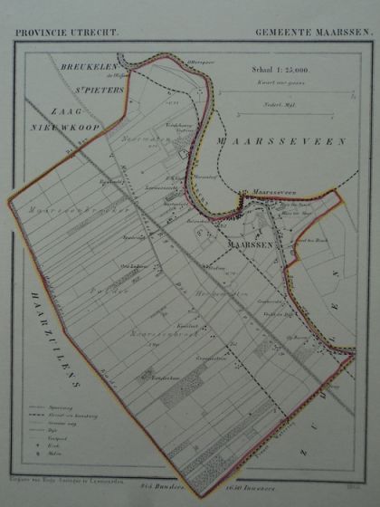De gemeentegrenzen zoals die rond 1865 gehanteerd werden, waren formeel vastgesteld in 1818. Wel was Maarssenbroek in 1857 bij Maarssen gevoegd, zodat de grens tussen de beide gemeenten was komen te vervallen. Kuyper gaf al die gemeentegrenzen veel aandacht. Bij de grensbepalingen hadden grensscheidingen die gemakkelijk in het landschap terug te vinden waren, de voorkeur gekregen. In de schriftelijke vastlegging daarvan werd dan ook waar mogelijk verwezen naar wegen, sloten, vaarten en naar de Vecht. Zo liep de grens tussen Tienhoven en Breukelen St Pieters deels langs de Tienhovensevaart, die geheel tot de gemeente Tienhoven behoorde. De grens tussen Maarsseveen en Westbroek lag deels langs de Nedereindsevaart, die ressorteerde onder Westbroek. Tussen Maarssen en Maarsseveen fungeerden onder andere de Kaatsbaan en de Vecht als grens; de grenslijn liep in deze beide gevallen dwars door het midden van de weg of de rivier. Dat is bijvoorbeeld te zien aan de grens tussen Maarssen en Maarsseveen, waarbij de grens midden door de Vecht is aangegeven met een stippellijn. De inkleuring suggereert echter dat de grenzen langs de oevers lopen en de rivier dus tot geen van beide gemeenten behoort.