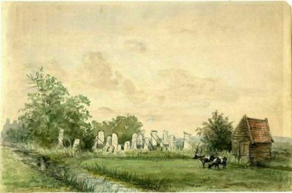 De situatie die wij nu kennen, is anders. Door de aanleg van het waterleidingkanaal in de jaren vijftig van de vorige eeuw is er van het restant van perceel 448 vrijwel niets meer over: het wandelpad langs de dijk van het kanaal is nu alleen door een sloot gescheiden van het oude deel van het kerkhof. Vanaf dat pad zijn de overgebleven zerken goed te zien (. Toen Zwarts de begraafplaats bezocht, stond er van de houten zerken geen enkele meer overeind. Hij vond nog wel twee stenen zerken op het oude stuk van de begraafplaats. Over één van die stenen schreef hij: 16)