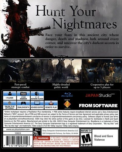 Introducing Bloodborne, the latest Action RPG from renowned Japanese developer FromSoftware, exclusively for the PlayStation®4 system. Face your fears as you search for answers in the ancient city of Yharnam, now cursed with a strange endemic illness spreading through the streets like wildfire. Danger, death and madness lurk around every corner of this dark and horrific world, and you must discover its darkest secrets in order to survive.