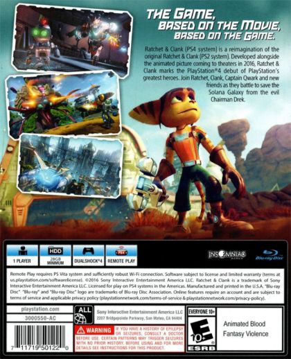 Play the game, based on the movie, based on the game! Developed alongside the major motion CG-animated picture coming to theatres in 2016, Ratchet & Clank (PS4) marks the PlayStation 4 debut of PlayStation's greatest intergalactic heroes, Ratchet and Clank, as they battle to save the Solana Galaxy from the evil Chairman Drek.