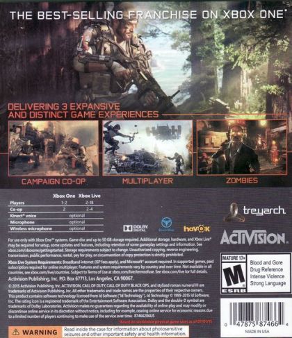 CAMPAIGN: The Black Ops III campaign is designed for four-player online co-op and re-playability on the next-gen, with players encountering the epic cinematic moments Call of Duty® is known for in new open-area engagements designed to allow players to approach the game with a different strategy each time they play. Every player is completely customizable: from weapons and loadouts, to abilities and outfits, all with full progression systems and a personalized armory to show off accomplishments, providing a constantly-evolving campaign experience.