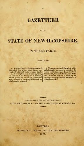 A surplus of geological information can be found in this publication, which provides a gazetteer of the state of New Hampshire. Opening with the situation of the state, the author describes New Hampshire's climate and seasons, canals and turnpikes, monuments, vegetable production and agriculture, domestic and wild animals, government, military strength, religion, customs, institutions, companies, societies, and state prison. Division of the state is also covered in this section, giving general information on each township. Part II begins on page 219, which offers tables with the course and distance on a direct line from Portsmouth, Concord, Boston, and Portland, as well as a table of the town in each county of New Hampshire with the number of polls, proportion of taxes in 1775 and 1812, number of horses over four years old, number of meat cattle over two years old, number of acres of orchard, and the number of sheep, both arranged alphabetically. This source of helpful geographic information provides locations of villages, streams and other features which may have disappeared or been renamed, and it is also just plain fascinating reading. This work concludes with an index to full-names and places.