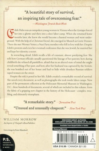 #1 New York Times BestsellerEdith Hahn was an outspoken young woman in Vienna when the Gestapo forced her into a ghetto and then into a slave labor camp. When she returned home months later, she knew she would become a hunted woman and went underground. With the help of a Christian friend, she emerged in Munich as Grete Denner. There she met Werner Vetter, a Nazi Party member who fell in love with her. Despite Edith's protests and even her eventual confession that she was Jewish, he married her and kept her identity a secret.In wrenching detail, Edith recalls a life of constant, almost paralyzing fear. She tells how German officials casually questioned the lineage of her parents; how during childbirth she refused all painkillers, afraid that in an altered state of mind she might reveal something of her past; and how, after her husband was captured by the Soviets, she was bombed out of her house and had to hide while drunken Russian soldiers raped women on the street.Despite the risk it posed to her life, Edith created a remarkable record of survival. She saved every document, as well as photographs she took inside labor camps. Now part of the permanent collection at the Holocaust Memorial Museum in Washington, D.C., these hundreds of documents, several of which are included in this volume, form the fabric of a gripping new chapter in the history of the Holocaust—complex, troubling, and ultimately triumphant.