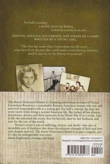 Nonna Bannister carried a secret almost to her Tennessee grave: the diaries she had kept as a young girl experiencing the horrors of the Holocaust. This book reveals that story. Nonna's childhood writings, revisited in her late adulthood, tell the remarkable tale of how a Russian girl from a family that had known wealth and privilege, then exposed to German labor camps, learned the value of human life and the importance of forgiveness. This story of loss, of love, and of forgiveness is one you will not forget.