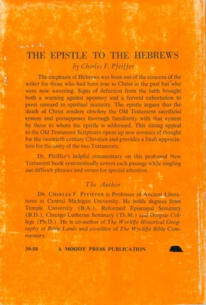 The emphasis of Hebrews was born out of the concern of the writer for those who had been true to Christ in the past but who were now wavering. Signs of defection from the faith brought both a warning against apostasy and a fervent exhortation to press onward to spiritual maturity. The epistle argues that the death of Christ renders obsolete the Old Testament sacrificial system and presupposes thorough familiarity with that system by those to whom the epistle is addressed. This strong appeal to the Old Testament Scriptures opens up new avenues of thought for appreciation for the unity of the two Testaments. Dr. Pfeiffer's helpful commentary on this profound New Testament book systematically covers each passage while singling out difficult phrases and verses for special attention. This Everyman's Bible Commentary is based upon the scriptural text as found in the King James Version.