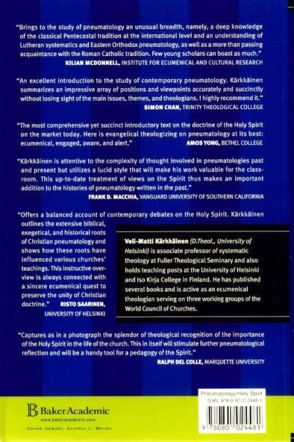 One of the most exciting recent developments in theology has been an unprecedented interest in the person and work of the Holy Spirit. In fact, Veli-Matti Karkkainen describes this phenomenon as a "pneumetalogical renaissance." But such discussion should be informed, he contends, by two overarching principles. First, we must acknowledge the variety of approaches to the experience of the Holy Spirit ecumenically: "No church can claim a monopoly on the Spirit, and no tradition is specifically 'spirited.'" Second, talk about the Spirit must always be contextual and therefore culture-specific: "The spirit of God . . . indwells believers and creation in specific and tangible ways." Working from this perspective, the book introduces readers to pneumatology, the theology and spirituality of the Holy Spirit, in current international theology. As such, the work offers a biblical, historical, and theological assessment of the Third Person of the Trinity. However, unlike most textbooks on pneumatology, Karkkainen takes a fresh, innovative approach. Rather than focusing on any single topic, his aim is to chart the various territories of contemporary writings and reflections on pneumatology. Consequently, the volume examines various theological and denominational understandings of the Spirit (all major Christian traditions are reviewed), assesses key contemporary theologians of the Spirit (e.g., Pannenberg, Moltmann, and Pinnock), and inquires into several contextual approaches (e.g., liberation, feminist, and green). These distinctives and the emphasis on the contemporary global scene make this a unique volume. An up-to-date survey of the most noteworthy and theologically pregnant orientations to the Spirit in the worldwide ecumenical and intercultural scene, this work will guide readers in discerning the Holy Spirit's activity at the beginning of the third millennium.--discusses ecumenical, international, and contextual pneumatologies--ecumenical emphasis ranges from Eastern Orthodox to Pentecostal/charismatic--international scope gives voice to African and Latin American perspectives--covers major pneumatologies--provides a comprehensive bibliography