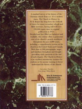 A standard survey of the history of the Christian church from A.D. 33 to modern times, The Church in History by B. K. Kuiper has long been the textbook of choice for many secondary schools and Bible institutes, having sold well over 150,000 copies since first published more than a half century ago. Detailed and fact-filled yet balanced and readable, this volume offers a panoramic view of the church's growth worldwide throughout the past 2,000 years, including a comprehensive section on the church in the United States and Canada. With close to 300 photographs, maps, and timelines throughout and thought-provoking study questions at the end of each chapter, The Church in History is an excellent introductory resource for students or for anyone wanting to better understand the history of the church.