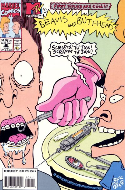 Beavis and Butt-Head visit a yam-stuffed Maxi-Mart where they have an altercation with the clerk. The Punisher Parody one-pager. An advertisement for the Swedish band "Entombed" and the new limited-edition version of their "Wolverine Blues" CD. Dental Hygiene Dilemma - Part Two. Silver ink cover, first printing. Devil Dinosaur parody.