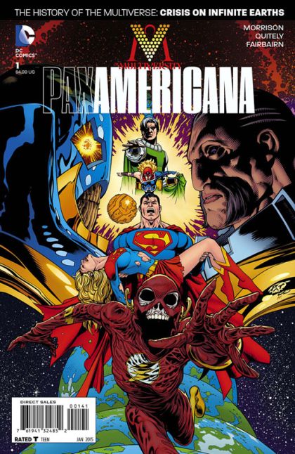 Brace yourselves for the next exciting chapter of THE MULTIVERSITY as the acclaimed ALL-STAR SUPERMAN team of writer Grant Morrison and artist Frank Quitely investigate the conspiracy on Earth-4, home of Pax Americana! Told backwards through an experimental storytelling technique that reveals new mysteries with each turn of the page, PAX AMERICANA stars The Question, Blue Beetle, Captain Atom, Nightshade and Peacemaker like you've never seen them before! As the assassination of the U.S. president leads to political intrigue, interpersonal drama and astro-physical wonder, the truth behind the crime and those involved will blow your mind! What confidential conversation between the president and Captain Atom could reveal everything? How far will The Question take his hunt for the truth before he hurts his former friends - or himself? And who is the steel-handed bogeyman operating in the shadows? Discover all this and more in this exciting stand-alone issue which also acts as chapter four of the MULTIVERSITY storyline. Join us, if your dare, for THE MULTIVERSITY!