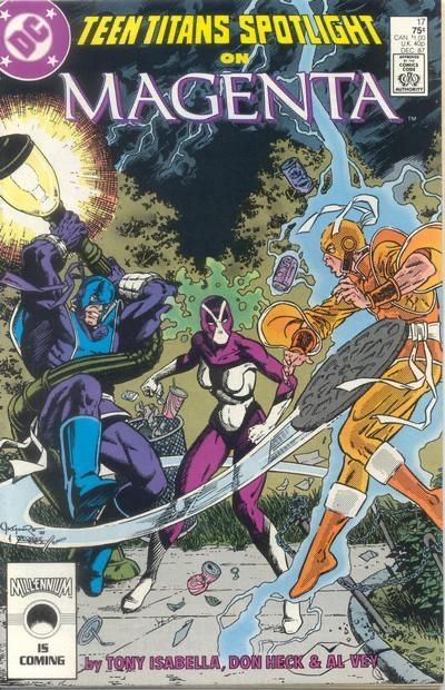 Written by Tony Isabella. Art by Don Heck, Al Vey, and Pablo Marcos. Cover by Jerome K. Moore and George Perez. Magenta flies over New York, talking to Dr. Damalis over the radio. Dr. Damalis remembers the events leading up to the emergence of the Magenta persona in Frances Kane. Thunder and Lightning are in the Park. Magenta finds them and attacks. They run from a volley of metal into the woods. Looking for them, Magenta stumbles upon two men who try to mug her. She controls the metal in their knives to stop them. Thunder and Lightning find her, telling her to fight Dr. Damalis' brainwashing. 36 pages, full color. $0.75. Cover price $0.75.