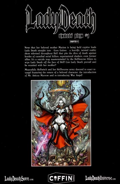 New Story! New Format! News that her beloved mother Marion is being held captive leads Lady Death straight into Gore Galore, a horrific, twisted reality show televised throughout Hell that pits the diva of death against hordes of cannibal serial killers, supernatural slashers, even former allies. It's a suicide trap masterminded by the Hellbourne Elders to wipe Lady Death off the face of Hell! Can Lady Death prevail and be reunited with her mother? Meanwhile, Hellwitch and her Hellbourne army descend to exact revenge! Featuring the return of a beloved character, the introduction of Mr. Atticus Marrow and re-introducing War Angel!