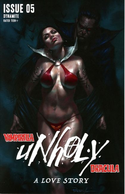 Vampirella's efforts to save the man she loves have completely collapsed. After the shocking revelation concluding our last issue (see below, which Matt absolutely won't spoil here), Vampirella finds herself completely outflanked by the Lord of Darkness! Dracula has fully assimilated his human host while his shadow army, Lumea Urm?toare, prepares Vampirella as a ritual sacrifice-with her mother's blessing! Can this unholy love survive?
