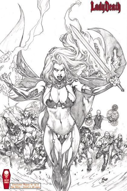 "Deathocalypse", an official year long event begins here! Caprice's mental manipulations unleashed Lady Death's evil side and New Orleans paid the price in wanton death and destruction. Recovered, Lady Death is now seen worldwide as a villain to be feared and eliminated. Meanwhile, the extinction-level villain Insurrectus and his new mate Atrocity plan to usher in a new horrific age of terror. Can the diva of death overcome this catastrophic crusade she struggles against her own wicked appetites, or are we all doomed once and for all?