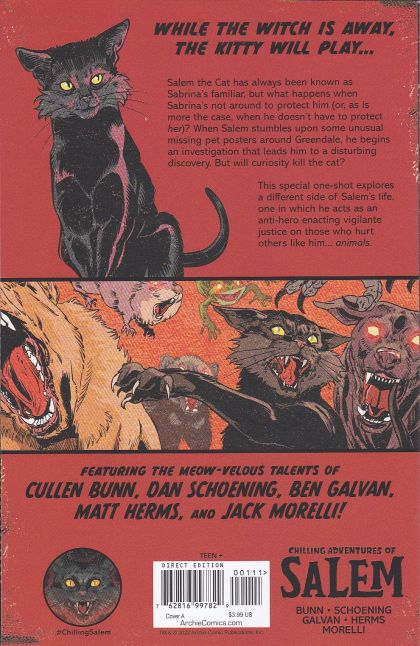 Salem the Cat has always been known as Sabrina's familiar, but what happens when Sabrina's not around to protect him (or, as is more the case, when he doesn't have to protect her)? This special one-shot explores a different side of Salem's life, one in which he acts as an anti-hero enacting vigilante justice on those who hurt others like him animals, in a horror story that's equal parts Pet Sematary and Hereditary.
