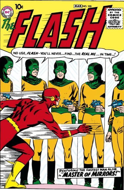 "The Master of Mirrors!" - While in prison, Sam Scudder accidentally discovered mirrors that can retain a reflection indefinitely. He soon develops these mirrors so that they can cast three dimensional illusions, and uses some to take the appearance of a bank teller in order to rob a bank. Barry Allen is in line to use the tellers, and notices that the teller's hair is parted on the wrong side, and that his wedding ring is on the wrong hand. Suspecting foul play, he follows the Mirror Master in his guise into the Mirror Master's hideout, which is filled with illusory traps. Realizing that the traps are illusions, Flash navigates through the house and captures the Mirror Master.