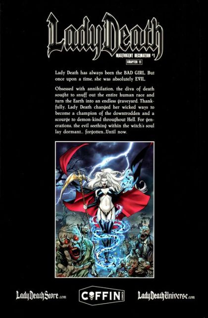 Lady Death has always been the BAD GIRL. But once upon a time, she was absolutely EVIL. Obsessed with annihilation, the diva of death sought to snuff out the entire human race and turn the earth into an endless graveyard. Thankfully, Lady Death changed her wicked ways to become a champion of the downtrodden and a scourge of demon-kind throughout Hell. For generations, the evil seething within the witch's soul lied dormant....forgotten...until now! Something has awakened-a sinister passion that leads Lady Death to the darkest corners of the globe. Leaving piles of bloody bodies in her wake, she seeks a mysterious power never before seen by mankind. But for what nefarious purpose? Featuring the key first appearance of the newest Coffinverse characters: Devilock, Demon hunter Muuaji and the hoodoo princess Madam Midnight. Also guest starring La Muerta!