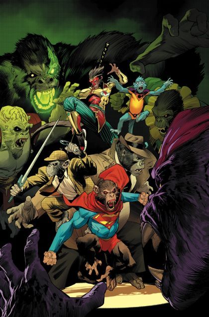 GET READY TO GO BANANAS IN THIS APE-IC ADVENTURE! CAUTION: An ape-surd amount of bad ape puns are incoming. Please be ape-vised. Gorilla Grodd's recent incarcer-ape-tion in the pages of The Flash has left a void that Monsieur Mallah is more than happy to fill. Ape-sembling a group of the DCU's most sinister simians, Mallah forms the Legion of D(oo-oo-ah-ah)m, with an eye toward world domin-ape-tion. But the world won't be conquered that easily! Enter the all-ape JUNGLE L(ee-ee)gue. Can this team of hero-eek anthropoids be the salv-ape-tion we need, or will Mallah's team of maniacal monkeys bring forth the ape-pocalypse? Get ready to go bananas as we honor DC's storied history with mankind's closest relatives in this ape-ic adventure! It's gonna be orangu-tastic, so heat up a capuchin-o, prepare a batch of chocolate chimp cookies, and get ready to r(ee-ee)d the one comic b(oo-oo)k this year that's guaranteed to make you go...APE!