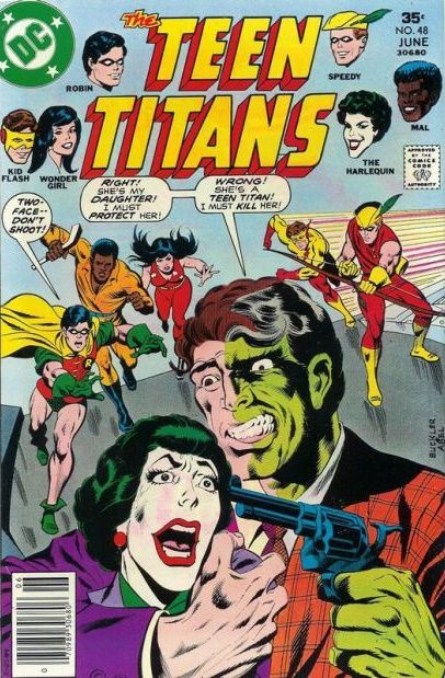 Robin and the Joker’s Daughter escape from Two-Face and warn the other Titans of his plan to blow up both New York and Gotham City. They are delayed by an altercation with the Bumblebee, actually Mal’s girlfriend Karen Beecher in a new costumed identity, but Kid Flash and Mal nevertheless join Robin in time to save New York, while Wonder Girl and Speedy team with the Joker’s Daughter to safeguard Gotham City. Two-Face is reunited with his “daughter” and learns of her crimefighting identity, while Duela takes on a new role as the Harlequin, and Aqualad appears near death after unexplained spells of weakness and unconsciousness during the preceding case.