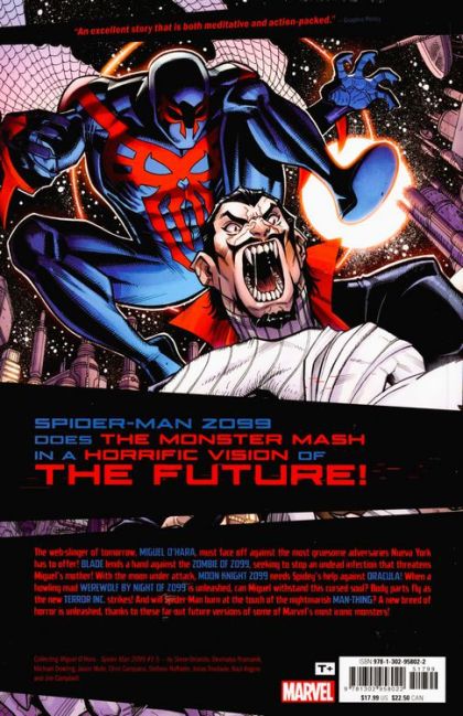Spider-Man 2099 does the monster mash in a horrific vision of the future! The web-slinger of tomorrow, Miguel O'Hara, must face off against the most gruesome adversaries Nueva York has to offer! Blade lends a hand against the Marvel Zombie, seeking to stop an undead infection that threatens Miguel's mother! With the moon under attack, Moon Knight 2099 needs Spidey's help against Dracula! When a howling mad Werewolf by 2099 is unleashed, can Miguel withstand this cursed soul? Body parts fly as the new Terror Inc. strikes! And will Spider-Man burn at the touch of the nightmarish Man-Thing? A new breed of horror is unleashed, thanks to these far-out future versions of some of Marvel's most iconic monsters! Collecting MIGUEL O'HARA - SPIDER-MAN 2099 #1-5. Rated T+