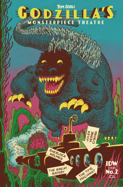 The roar of the twenties escalated to a mighty SKREONK as Godzilla attacked the party of the wrong man and hurt the wrong lady. Now Jay Gatsby has enlisted the help of Sherlock Holmes, Thomas Edison, Jules Verne, The Time Machinist, and more to put an end to the Godzilla threat once and for all. Watch as our new team travels twenty thousand leagues under the sea and turns Paris into the ultimate Godzilla trap in this thrilling feat of cartooning by the unrivaled Tom Scioli.