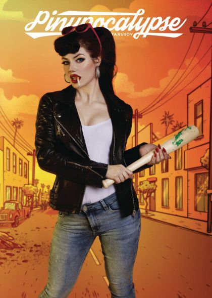 Series Creator and Artist Andrew Tarusov delivers this iconic feature image of the second of our two leading ladies, Roxy, as she prepares to fight an army of the undead. Pinupocalypse is a mix of 50's sci-fi and horror tropes reimagined with a clever twist. Set in 1950's small town America, this satirical adventure pits two stylish pin-up girls against hordes of zombies and aliens. Inspired by Hollywood filmmakers like Ed Wood, Sam Raimi and Edgar Wright, Pinupocalypse is an out-of-this-world story with a Gil Elvgren aesthetic to titillate readers! Foxy meets Roxy, when she saves her from being devoured by zombies (meat-cute?), but the relief doesn't last long once they realize the entire town has been transformed and they're surrounded! Miraculously escaping, they head to Foxy's house to wait it out, but Foxy doesn't know that her parents have prepared a surprise party with lots of guests... zombie guests!