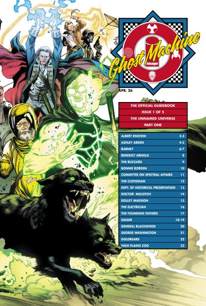 How hot does Geiger burn? What is the Committee on Spectral Affairs? Did George Washington really die? This new limited series collects all-new entries teasing tantalizing stories to come, as well as updated goods on Ghost Machine’s characters from across its hit titles beginning with The Unnamed Universe from GEIGER, JUNKYARD JOE, and REDCOAT! With interior character art from Ghost Machine’s all-star artists, don’t miss the outstanding classic homage covers that let you decide what ’80s inspired guidebook look you want to collect! This initial volume covers the first half of the world of The Unnamed from Albert Einstein to the High Plains Zoo!