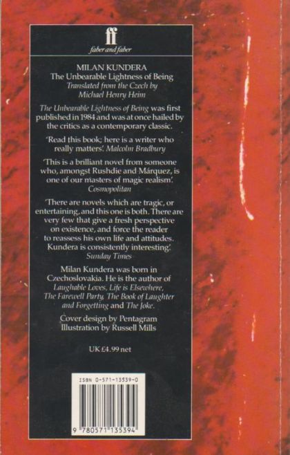 Librarian's note: There is an Alternate Cover Edition for this edition of this book here.In this novel - a story of irreconcilable loves and infidelities - Milan Kundera addresses himself to the nature of twentieth-century 'Being' In a world in which lives are shaped by irrevocable choices and by fortuitous events, a world in which everything occurs but once, existence seems to lose its substance, its weight. We feel, says the novelist, 'the unbearable lightness of being' - not only as the consequence of our private acts but also in the public sphere, and the two inevitably intertwine.Juxtaposing Prague, Geneva, Thailand and the United States, this masterly novel encompasses the extremes of comedy and tragedy, and embraces, it seems, all aspects of human existence. It offers a wide range of brilliant and amusing philosophical speculations and it descants on a variety of styles. In this classic novel Kundera draws together the Czechoslovakia of the Prague Spring and the Russian invasion, the philosophy of Nietzsche, and the love affairs of a number of heartbreakingly familiar characters.