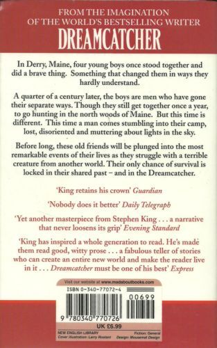 Once upon a time, in the haunted city of Derry (site of the classics It and Insomnia), four boys stood together and did a brave thing. Certainly a good thing, perhaps even a great thing. Something that changed them in ways they could never begin to understand. Twenty-five years later, the boys are now men with separate lives and separate troubles. But the ties endure. Each hunting season the foursome reunite in the woods of Maine. This year, a stranger stumbles into their camp, disoriented, mumbling something about lights in the sky. His incoherent ravings prove to be dis-turbingly prescient. Before long, these men will be plunged into a horrifying struggle with a creature from another world. Their only chance of survival is locked in their shared past -- and in the Dreamcatcher. Stephen King's first full-length novel since Bag of Bones is, more than anything, a story of how men remember, and how they find their courage. Not since The Stand has King crafted a story of such astonishing range -- and never before has he contended so frankly with the heart of darkness.