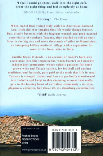 When Isobel Dusi visited Italy with her Australian husband Lou, little did they imagine that life would change forever. But, utterly besotted with the fragrant warmth and good-natured conviviality of Southern Tuscany, they decided to sell up their lives in the big city and move thousands of miles to follow the dream of a life more in keeping with ancient rhythms and time-honoured traditions of the Mediterranean. After months of searching they settled upon Montalcino, an intriguing hilltop medieval village with a reputation for some of the finest wine in Italy. VANILLA BEANS AND BRODO is an account of Isobel's hard-won acceptance into this tempestuous, warm-hearted and proudly independent community, whose voluble passions for home grown wine and Tuscan cuisine, for football and ancient traditions and festivals, puts paid to the myth that life in rural Tuscany is tranquil. Isobel and Lou are gradually transformed into Isabella and Luigi in this charming account of Tuscan village life that really gets to the beating heart of an Italian community - its joys, pleasures, anxieties, but above all, its absorbing eccentricities.