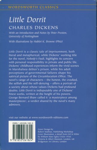 With an Introduction and Notes by Peter Preston, University of Nottingham. With Illustrations by Hablot K. Browne (Phiz). Little Dorrit is a classic tale of imprisonment, both literal and metaphorical, while Dickens' working title for the novel, Nobody's Fault, highlights its concern with personal responsibility in private and public life. Dickens' childhood experiences inform the vivid scenes in Marshalsea debtor's prison, while his adult perceptions of governmental failures shape his satirical picture of the Circumlocution Office. The novel's range of characters - the honest, the crooked, the selfish and the self-denying - offers a portrait of society about whose values Dickens had profound doubts. Little Dorrit is indisputably one of Dickens' finest works, written at the height of his powers. George Bernard Shaw called it 'a masterpiece among masterpices', a vedict shared by the novel's many admirers.