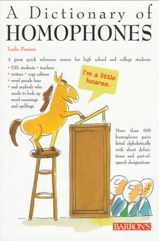 This handy book will be invaluable to English language learners and their teachers. It will also serve as a quick reference for writers and copy editors, as a supplement to dictionaries for anyone who needs to look up a word, and as a source for word puzzle fans. Homophones are words that sound alike but are spelled differently and have different meanings. Here are more than 600 homophone pairs, listed alphabetically, each with its own brief definition and part-of-speech designation. Some homophones are easy to distinguish—"ate" and "eight", for instance. Others can cause common spelling errors or confused meaning—for example, apprise, which means to give notice, and apprize, which means to appreciate or to value. Here is a volume that belongs on every language reference shelf. Cartoon illustrations.