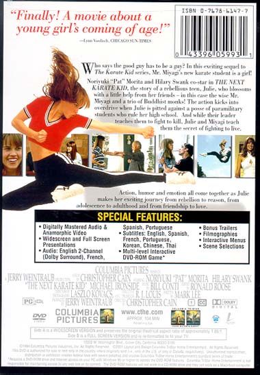 Since her parents death, raised by her grandmother and harassed at school, 17-year-old Julie Pierce (Hilary Swank, BOYS DON'T CRY) is very angry. Grandma can no longer handle her, so she convinces an old friend, Mr. Miyagi (Pat Morita), to care for the girl. He consents, and through the spirituality of karate, unravels the world as not hostile, but as fertile and welcoming.