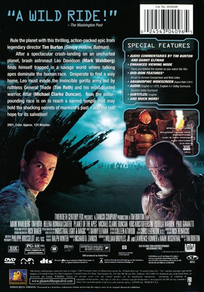 After a spectacular crash-landing on an uncharted planet, brash astronaut Leo Davidson (Mark Wahlberg) finds himself trapped in a savage world where talking apes dominate the human race. Desperate to find a way home, Leo must evade the invincible gorilla army led by Ruthless General Thade (Tim Roth) and his most trusted warrior, Attar (Michael Clarke Duncan).