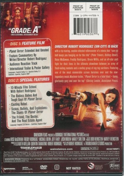 In Rodriguez's "Planet Terror," two doctors find their graveyard shift inundated with townspeople ravaged by sores. Among the wounded is Cherry, a dancer whose leg was ripped from her body. As the invalids quickly become enraged aggressors, Cherry and her ex-boyfriend Wray lead a team of accidental warriors into the night.