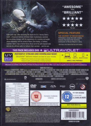 Following the death of District Attorney Harvey Dent, Batman assumes responsibility for Dent's crimes to protect Dent's reputation and is subsequently hunted by the Gotham City Police Department. Eight years later The Dark Knight, returns to Gotham, where he encounters the mysterious Selina Kyle and the villainous Bane, a new terrorist leader who overwhelms Gotham's finest, and the Dark Knight resurfaces to protect a city that has branded him an enemy.