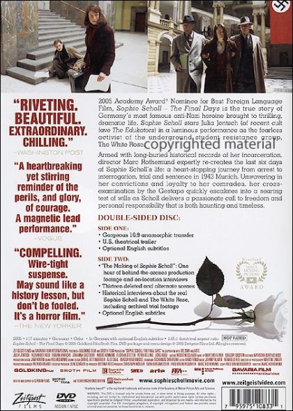 In 1943, as Hitler continues to wage war across Europe, a group of college students mount an underground resistance movement in Munich. Dedicated expressly to the downfall of the monolithic Third Reich war machine, they call themselves the White Rose. One of its few female members, Sophie Scholl is captured during a dangerous mission to distribute pamphlets on campus with her brother Hans. Unwavering in her convictions and loyalty to the White Rose, her cross-examination by the Gestapo quickly escalates into a searing test of wills as Scholl delivers a passionate call to freedom and personal responsibility.
