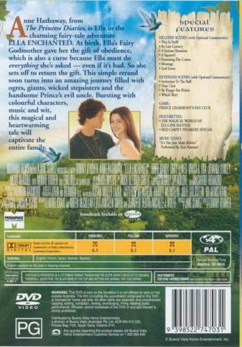 Ella of Frell is given the "gift of obedience" by a fairy, only to realize that it's more of a curse because it could separate her from her true love, Prince Charmont. Will Ella manage to conjure a "cure" that enables her to live happily ever after?