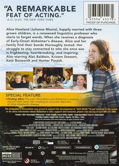 Alice Howland, happily married with three grown children, is a renowned linguistics professor who starts to forget words. When she receives a devastating diagnosis, Alice and her family find their bonds tested.