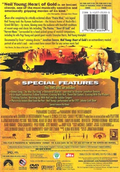 Heart of Gold is Jonathan Demme's intimate musical portrait of legendary singer / songwriter Neil Young, filmed on the occasion of the world premier of Young's "Prairie Wind" concert at Nashville's hallowed Ryman Auditorium in 2005. Young's music provides an emotionally rich view into this unique artists relationship to family, friends, mortality and the passage of time.
