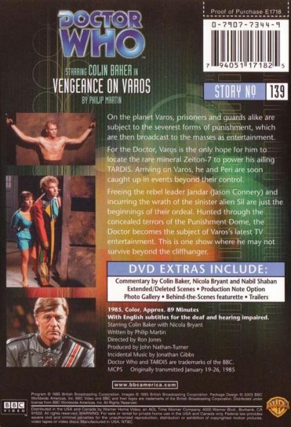 But Varos is a dangerous palce. Trapped in the dreaded Punishment Dome, the Doctor and Peri must fight for their lives - and save the starving population from the machinations of the villainous, reptilian Sil.