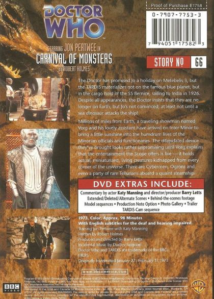 The Indian Ocean, 1935 - or is it? The Doctor and Jo arrive on the SS Bernice, a ship due to mysteriously vanish without trace. But why do events seem to repeat themselves, and why is a plesiosaur attacking the ship? Meanwhile, on the planet Inter Minor, travelling showman Vorg arrives with his remarkable Miniscope...