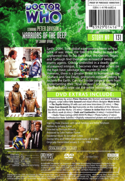 Earth, 2084. Two global superpowers hover on the brink of war. When the TARDIS is forced to make an unplanned visit to Sea Base Four, the Doctor, Tegan and Turlough find themselves accused of being enemy agents. Quickly embroiled in a deadly game of paranoid intrigue, it becomes clear that others on the base have sabatoge and murder in mind. However, there is a greater threat to humankind: the Silurians and Sea Devils, prehistoric reptiles seeking to reclaim the Earth. Can the Doctor prevent them from implementing their "final solution" and triggering a war that could wipe out the entire human race?