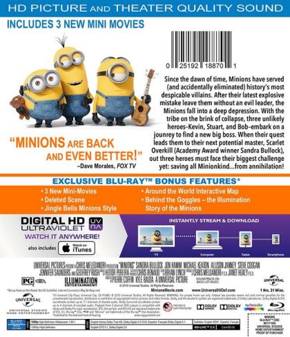 Since the dawn of time, Minions have served (and accidentally eliminated) history's most despicable villains. After their latest explosive mistake leaves them without an evil leader, the Minions fall into a deep depression. With the tribe on the brink of collapse, three unlikely heroes -Kevin, Stuart, and Bob - embark on a journey to find a new big boss. When their quest leads them to their next potential master, Scarlet Overkill (Academy Award winner Sandra Bullock), our three heroes must face their biggest challenge yet: saving all of Minionkind...from annihilation!
