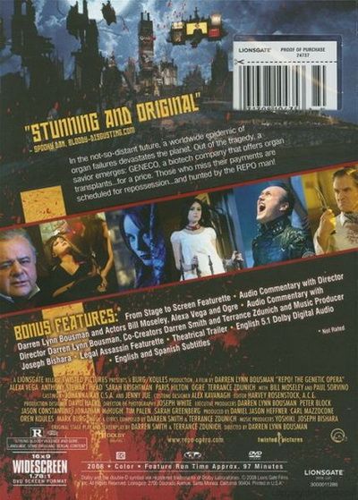 By the year 2056, an epidemic of organ failures has devastated the planet. The megacorporation GeneCo provides organ transplants on a payment plan - and those who can’t fulfill their plans have their organs repossessed. In the midst of this, a sickly teenager discovers a shocking secret about herself, her father, and their connection to GeneCo.