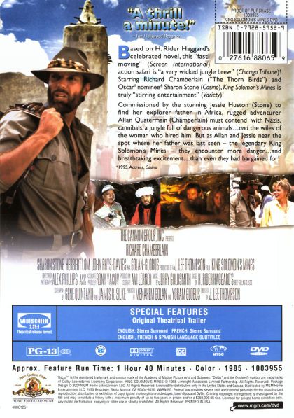 Ever in search of adventure, explorer Allan Quatermain agrees to join the beautiful Jesse Huston on a mission to locate her archaeologist father, who has been abducted for his knowledge of the legendary mines of King Solomon. As the kidnappers, led by sinister German military officer Bockner, journey into the wilds of Africa, Allan and Jesse track the party and must contend with fierce natives and dangerous creatures, among other perils.