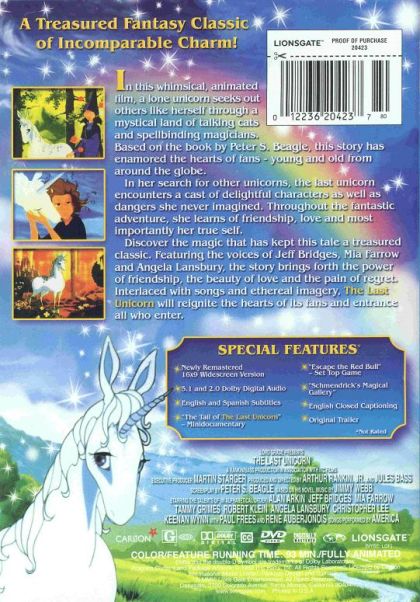 A unicorn learns from a riddle-speaking butterfly that she is supposedly the last of her kind, all the others having been herded away by the monstrous Red Bull. The unicorn sets out to discover the truth behind the butterfly's words. She is eventually joined on her quest by Schmendrick, a second-rate magician, and Molly Grue, a middle-aged woman who dreamed all her life of seeing a unicorn. Their journey leads them far from home, all the way to the castle of King Haggard.